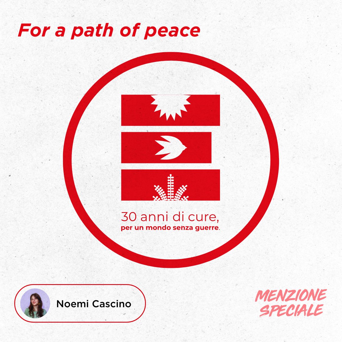 Nella prima illustrazione dal titolo For a path of peace, il logo di EMERGENCY diventa un contenitore di simboli: il sole, che illumina e scalda il nostro cammino, la colomba bianca a rappresentare la libertà, l’ulivo per la pace, il sostentamento e la fertilità. Completa l’immagine di Noemi Cascino la scritta `30 anni di cure, per un mondo senza guerre`.