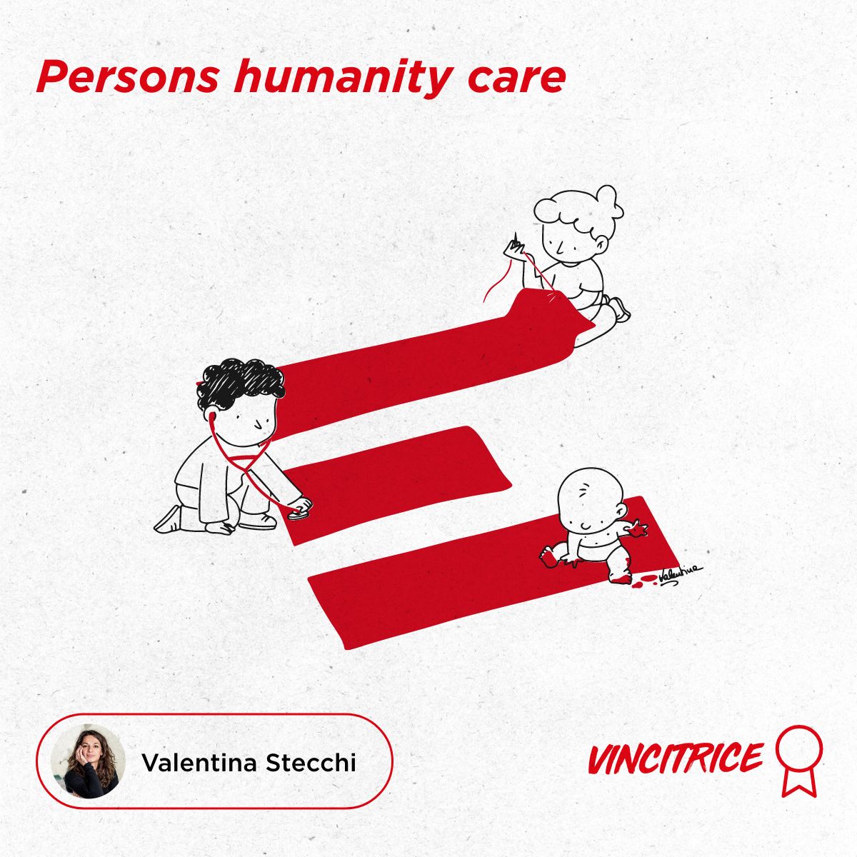 L’immagine proposta da Valentina Stecchi, invece, raffigura tre figure umane che interagiscono con il logo di EMERGENCY: una sarta intenta a cucire, un richiamo alla suturazione delle ferite, ma anche all’atto di ricomporre fratture tra territori, popoli, culture; un medico con uno stetoscopio intento ad auscultare la parte centrale della E del logo dell’Ong a rappresentare la cura e l’attenzione ad un ascolto profondo e infine un bebè che gattona e gioca con le mani immerse nella vernice rossa. Nell’insieme un’allusione all’impegno dell’Associazione per i diritti umani, alla sua pratica quotidiana per il diritto alla cura in Italia e nel mondo e al suo futuro.