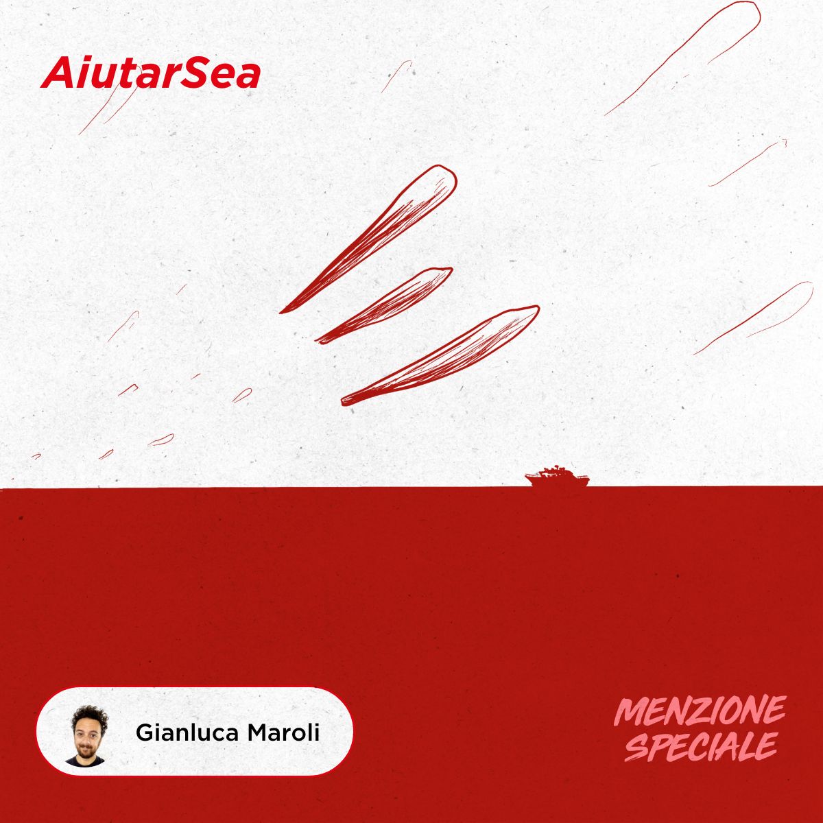 Una nave che naviga sul mare ed è sferzata dal vento, elemento che nel cielo si compone a formare la grande E del logo di EMERGENCY è invece l’immagine di Gianluca Maroli. Tutta in rigoroso bianco e rosso, si intitolata AiutarSea: un gioco di parole che insieme all’immagine esprime contemporaneamente sia l’aiuto reciproco che ci si offre tra membri di una stessa comunità, come è la famiglia umana, sia il mare dove EMERGENCY svolge attività di ricerca e soccorso grazie alle quali dal dicembre 2022 allo stesso mese del 2023 ha salvato 1.219 persone.