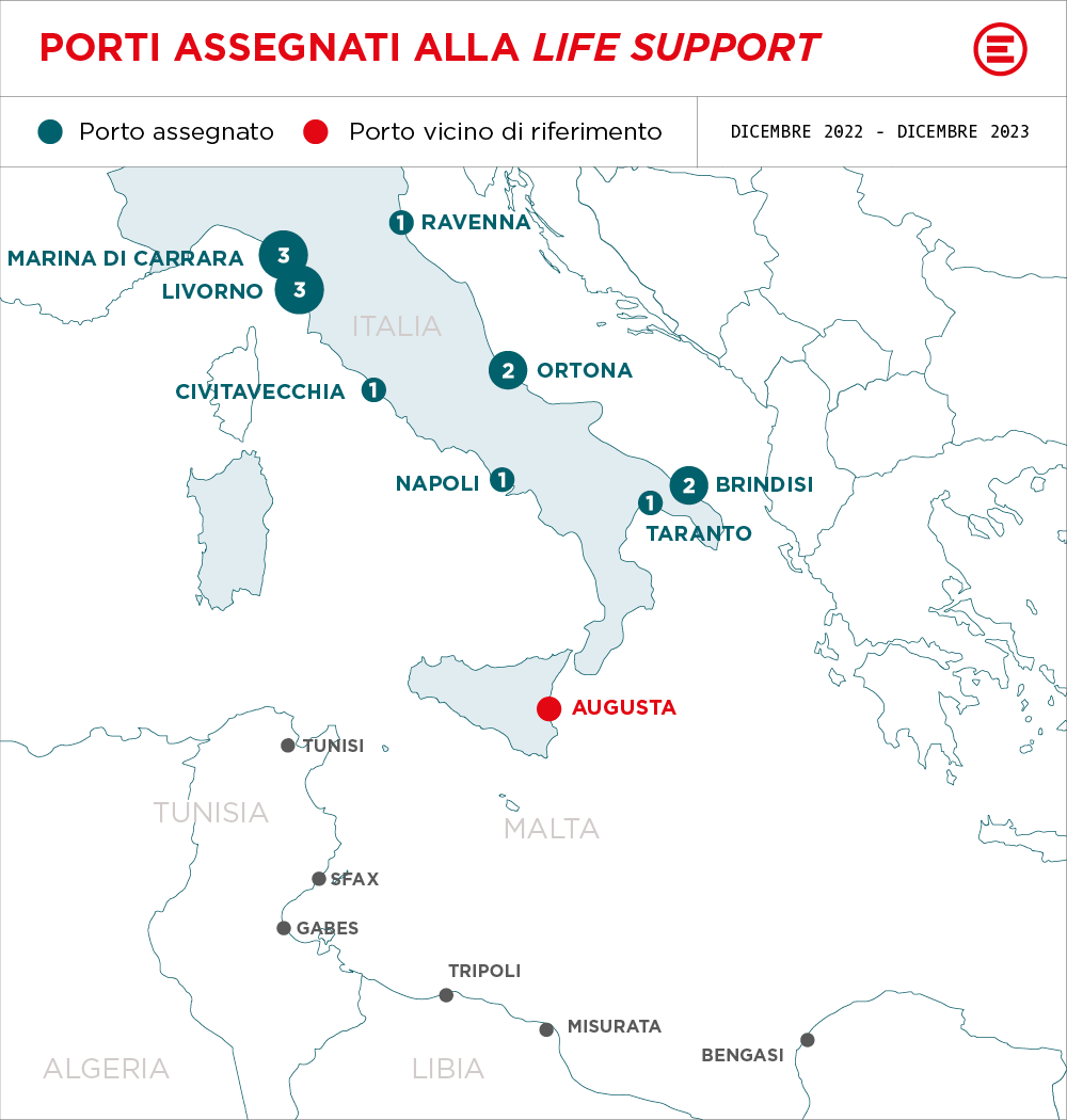 Tra le misure del “Decreto Piantedosi”, un atto legislativo del Governo tramutato nella legge n. 15/2023, che contiene “Disposizioni urgenti per la gestione dei flussi migratori”, è stata introdotta una sistematica prassi di assegnazione alle navi delle ONG di porti molto distanti dalle aree in cui viene effettuata l’operazione di soccorso.