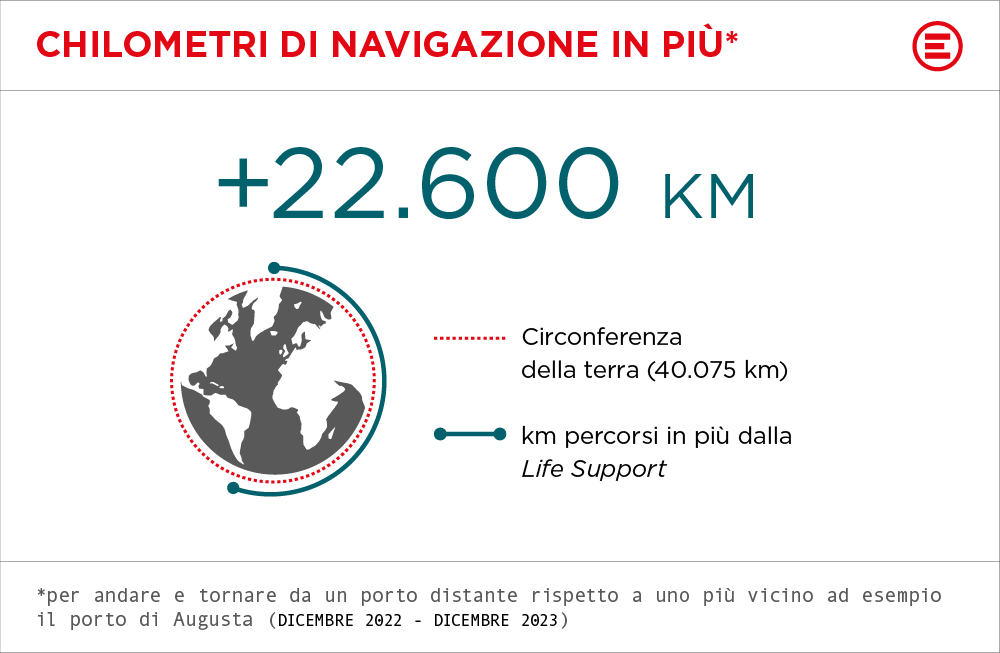Per raggiungere i porti lontani – assegnati dal Centro di Coordinamento del Soccorso Marittimo italiano – la Life Support ha percorso in media 630 miglia nautiche, impiegando 3,5 giorni di navigazione a missione.
