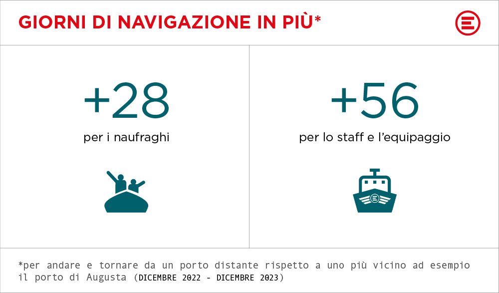 I viaggi per arrivare ai porti e tornare nel Mediterraneo hanno comportato 56 giorni di navigazione in più rispetto a un porto nel Sud Italia, allontanando le navi dalle zone SAR, sottraendo tempo prezioso alle attività di ricerca e soccorso.